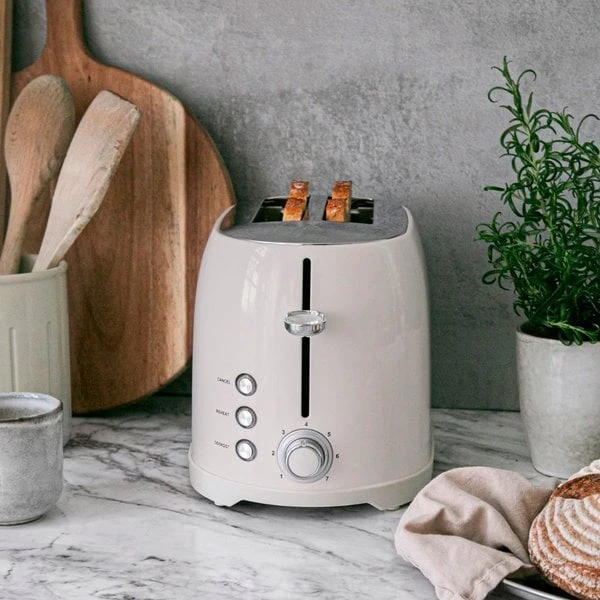 Creme White brödrost har en effekt pÄ 800 watt och rymmer tvÄ skivor. Den Àr utrustad med en praktisk smulbricka för enkel rengöring och har funktionerna stopp, ÄteruppvÀrmning, upptining och rostning i sju nivÄer. Den Àr 31 centimeter lÄng, 18 centimeter hög och 20 centimeter djup.