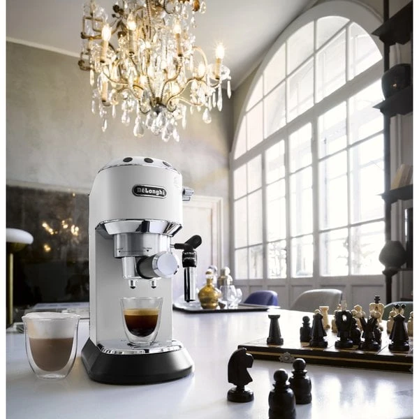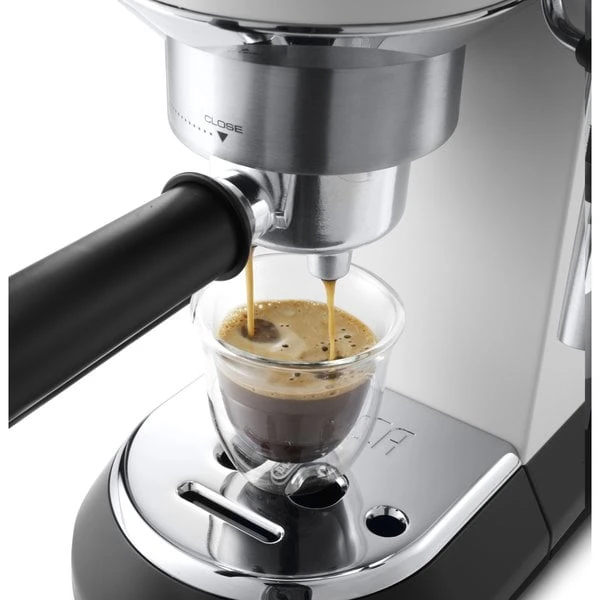 DeLonghi Dedica EC685 espressomaskin har ett inbyggt termoblock, som gör maskinen klar till att brygga espresso efter bara 30-40 sekunder. Samtidigt Àr steamern klar efter ytterligare 15 sekunder. Du kan alltsÄ fÄ en kopp kaffe precis innan du ska utanför dörren. Du behöver inte vara rÀdd om du skulle glömma att stÀnga av maskinen. Du kan stÀlla in den till att stÀnga av sig sjÀlv efter 9 min, 30 min eller 3 timmar. Espressomaskinen har en pressureized filterkorg, vilket betyder att filterkorgen har en massa smÄ hÄl som vattnet kan rinna ut igenom, men bara en eller fÄ i botten. Det gör att espressomaskinen kan bearbeta förmalet kaffe som inte Àr sÄ fint malet.