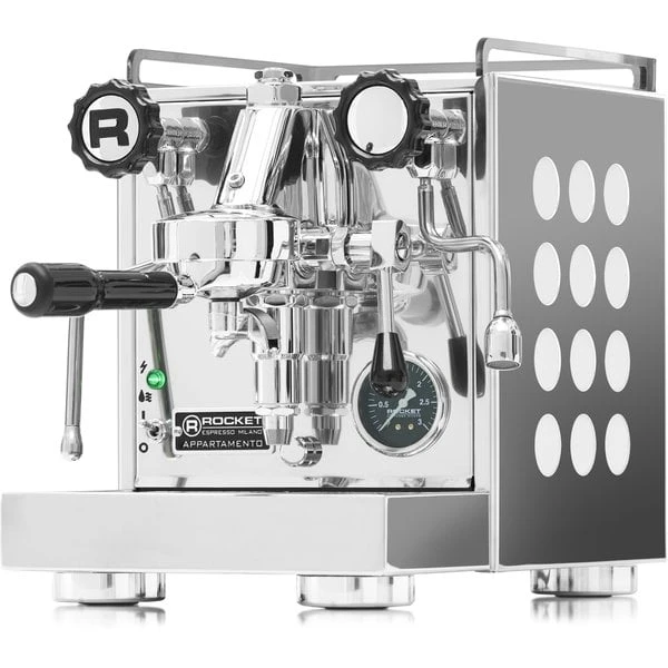 En högkvalitativ espressomaskin frÄn Milano-baserade tillverkaren Rocket. Deras kaffemaskiner tillverkas i en noggrann process som krÀver ett gediget handarbete för att sÀkerstÀlla kvaliteten i varje liten detalj. Appartamento Àr namnet pÄ en av Rockets mindre modeller och den passar dÀrför bra i kök dÀr all yta Àr vÀrdefull. Med Appartamento espressomaskin kan man brygga espresso till perfektion, och pÄ köpet fÄr man ett snyggare kök.