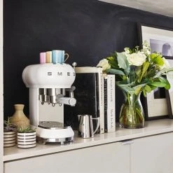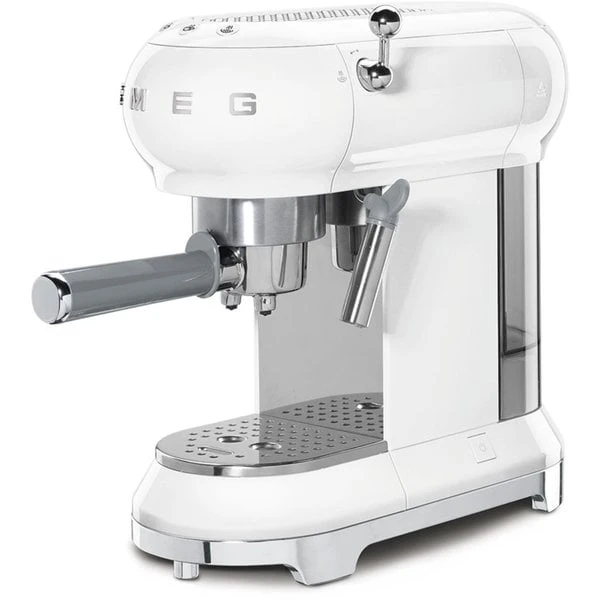 Brygg en stark espresso eller krÀmig cappuccino med denna klassiska, manuella espressomaskin frÄn Smeg i retrolook. Espressomaskinen pressar espresson vid 15 bar och har en inbyggd Äng-funktion, vilket gör att du kan blanda ner Ängande varm mjölk i ditt kaffe. ECF01WHEU kan brygga upp till 2 koppar Ät gÄngen och levereras med tvÄ filter med plats för malda bönor för respektive en och tvÄ koppar. För att fÄ plats med större koppar kan du enkelt ta loss droppbrickan.
